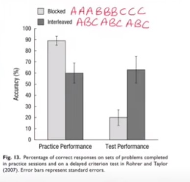 Toplam 3 dersiniz olduğunu varsayarsak A dersi B dersi C dersi. Eğer AAABBBCCC şeklinde çalışırsanız buna blok öğrenme denir. ABCABCABC şeklinde çalışırsanız buna serpiştirilmiş çalışma denir. Araştırmalara göre çalışmanın hemen ardından sınav olacaksanız blok şeklinde öğrenme çok daha mantıklı çok daha iyi kavrayabiliyorsunuz, formülleri daha iyi hatırlıyorsunuz. Fakat sene sonuna ya da 2-3 sene sonunda bir sınavınız varsa blok şeklinde çalışmak etkili olmaz çünkü sizin konuları genel olarak görmenizi engelliyor. Serpiştirerek öğrenmek sizin bütün konular arasında kıyaslama yapmanızı ve önünüze bir soru çıktığında bunun hangi konuya ait olduğunu anlamanızı sağlıyor.