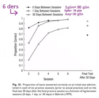 Son yöntem ise aralıklı öğrenme bunun için yine 3 grup oluşturuluyor. Ve bunlara İspanyolca dersi veriliyor. İlk grup 6 oturumluk dersi toplam 1 gün içerisinde alıyor.İkinci grup 6 oturumluk dersi her gün 1 er tane olmak üzere toplam 6 günde veriliyor. Üçüncü grup 6 oturumluk dersi 1 ay aralıkla toplam 6 ay da alıyor. Ve her gruba kendi dersleri verildikten sonra bir sınav yapılıyor. 1 gün ve 6 günde bitiren grup yüksek ve aynı skoru alıyor.6 ayda bitiren grup ise düşük skor alıyor çünkü çoğu bilgiyi unutmuş oluyorlar. Ama bu sefer her grup 6. oturumu bittikten 30 gün sonra bir sınava tabi tutuluyor ve 30 gün aralıkla toplam 6 ayda öğrenenler 30 gün sonra daha başarılı oluyor. Uzun aralıkla öğrendiğimiz bir şeyin uzun süreli hafızamızda, kısa aralıkla kısa öğrendiğimiz bir şeyinde kısa süreli hafızamızda yer ettiğini öğrenebiliriz. Yani düzenli ve tekrar ederek çalışırsanız sene başında çalıştığınız konuları sene sonunda ki sınavlarda daha etkili bir şekilde hatırlayabilirsiniz.