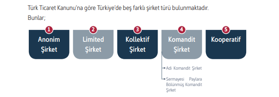 Anonim şirket ve Limited şirket Türkiye'de en yaygın görünen şirket türleridir. Yaklaşık olarak tüm şirketlerin %82'si Limited şirketi, %13'ü Anonim şirketi, %4'ü ise Kooperatiftir. Kollektif ve Komandit şirketlerin toplamı ise %1 civarındadır.