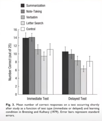 Bu öğrencilere iki tane test uygulanıyor. Birincisi bu araştırmanın hemen ardından diğeri ise araştırmadan 1 hafta sonra yapılıyor. Hemen ardından yapılan testte en fazla bilgiyi yazdığı için ikinci grup (her sayfadan 3 cümle özet çıkaran grup) 1.oluyor ama bu durum bize ‘demek ki ne kadar fazla not alırsak o kadar iyi’ dedirttirmesin çünkü 1 hafta sonraki yapılan testte bu sefer birinci grup (bütün metinden toplam 3 cümle özet çıkaran grup) ikinci grubu geçiyor.